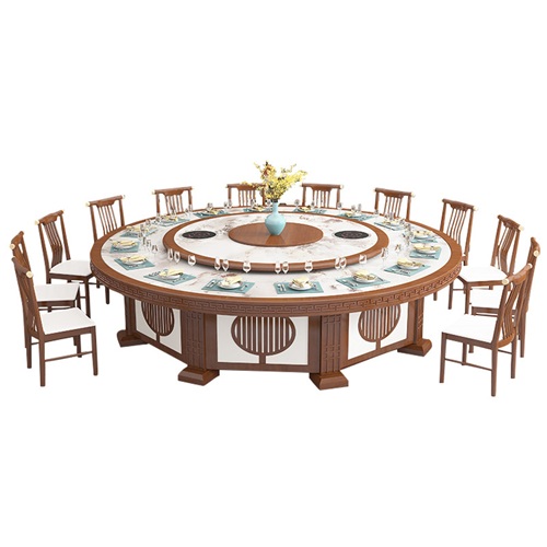 。这款酒店包房新中式大理石电动转盘2.8米火锅餐桌采用的是棕白两种颜色的搭配。棕白配是很经典的搭配,用棕白两色的对比表现出不同的美感。成熟的人说棕色代表大方。白色体现出华丽而高雅的品质,表现出对纯真、神圣、幸福美好生活的向往和追求。白色与具有强烈个性的色彩搭配可增强青春活跃的魅力,表现出不同的情感效果。总之白色与棕色的搭配表现强烈的对比视觉,给用餐者留下深刻的印象。