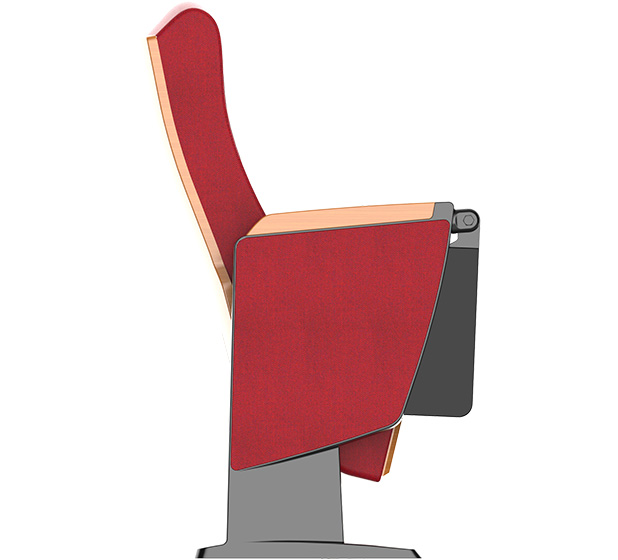 4.下藏式写字板:写字板链接铝头、托板采用优质铝合金材料经模具一体压铸成型。写字板面板采用ABS复合材料经模具一体注塑成型,写字板固定方式为机械原理高强度螺栓,使写字板链接部位越用越结实,不会出现松弛现象,尺寸规格:长度为381.2±2mm,宽度为261.2±2 mm,厚度为45mm;扶手和写字板向上倾斜6.5度保证书写自然状态,写字板打开回收时需带消音功能,不可有反弹力与噪音出现。